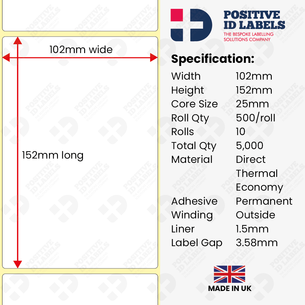 Description: 102mm x 152mm Direct Thermal Eco Labels with a choice of adhesives and core sizes. 500 labels per roll, 10 rolls per unit, 5000 labels in total.